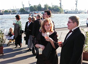 Unser Ziel war der Hamburger Hafen - das Salonrestaurant der Rickmer Rickmers bei den St. Pauli Landungsbrücken, Brücke 1 beim Fiete-Schmidt-Anleger in 20359 Hamburg. Für das leibliche Wohl war bereits vor unserer Ankunft vor der Rickmer-Rickmers durch die CCH Gastronomie gesorgt, ab 19.00 Uhr gab es auf dem Anleger einen Frucht-Cocktailempfang. Auf Wunsch wurde der erfrischende Frucht-Cocktail gern mit Sekt aufgefüllt.